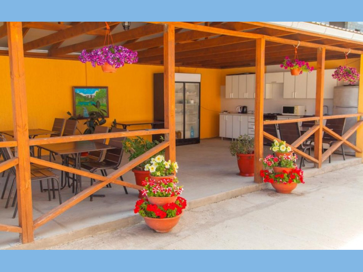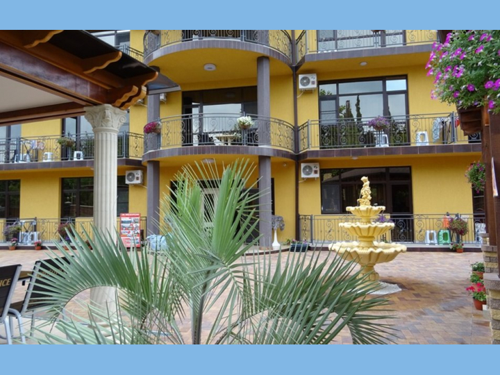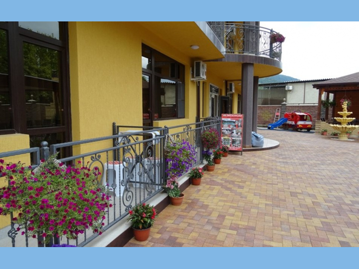 Отель представляет собой 4-этажный корпус с современным дизайном, окруженный пышной зеленью и цветами. На территории мини-отеля расположена столовая, летняя веранда и детская площадка. Номера отеля с комфортабельной обстановкой очень привлекательны для гостей. Панорамные окна и балконы открывают вид на живописные окрестности. Все номера имеют ванные комнаты, системы кондиционирования, холодильник, плоский телевизор, WI-FI, чайник, балкон.